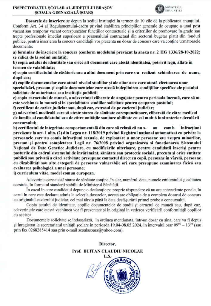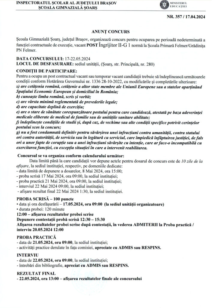 Scoala Gimnaziala Soars, judetul Brasov, organizeaza concurs pentru ocuparea pe perioada nedeterminata a functiei contractuale de executie, vacant POST Ingrijitor II-G1 norma la Scoala Primara Felmer/Gradinita PN Felmer.